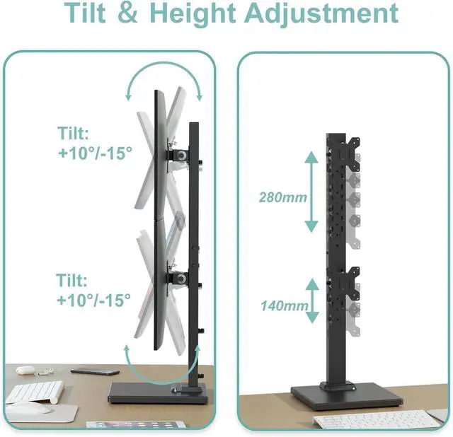 Swivel and Height Adjustment: The adjustable brackets allow for +50° to -50° swivel, +10° to -15° tilt, and 12 levels of height adjustment along the center pole. This flexibility enables you to position your monitors at the most comfortable viewing angles and heights, which can significantly reduce neck and shoulder strain during extended periods of use.