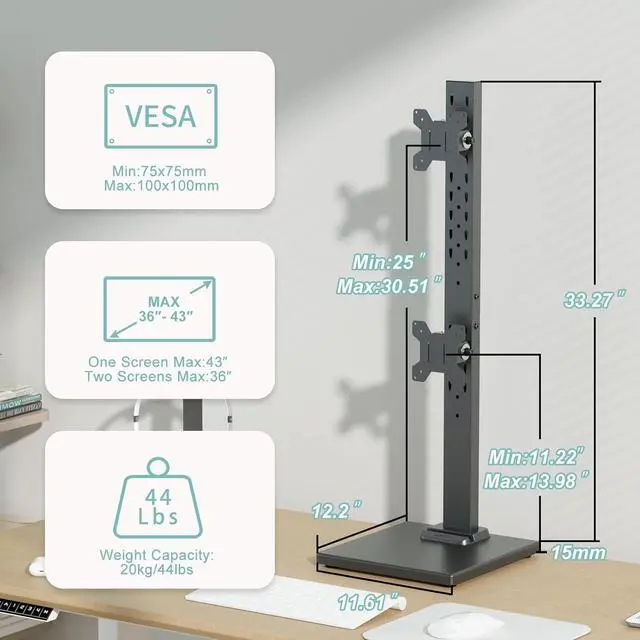 Compatibility: The mount is compatible with monitors ranging in size from 13 inches to 36 inches(DUAL) or 43inchsingle and can support a maximum weight of 44 pounds per monitor. It is designed to work with monitors that have VESA mounting patterns of 50x50mm, 75x75mm, or 100x100mm on the backside. This wide range of compatibility means it can accommodate a variety of monitor sizes and weights, making it suitable for most modern displays.