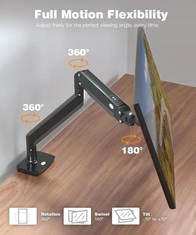 Universal Compatibility:This single monitor arm fits 22" to 43" LCD/LED screens, 33lbs max for flat and curved. This VESA monitor mount works with VESA 75x75mm / 100x100mm mounts. No hassle setup for home or office
