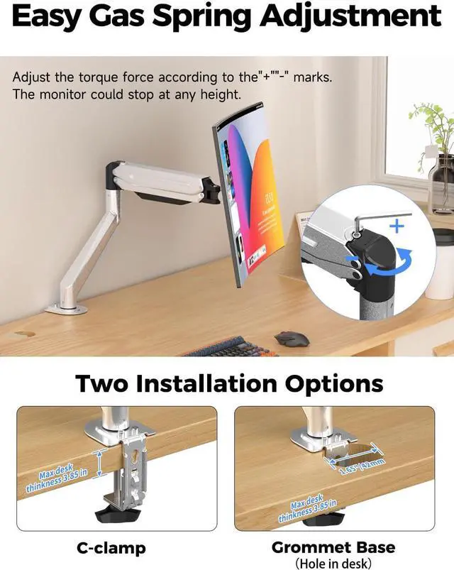 Dual table installation options. We understand that every desk is different. This mount offers versatile installation methods to suit your workspace. Use the C-clamp for a quick and sturdy setup on desks up to 3.85" thick, or utilize the grommet mount for a cleaner cable look. Note for grommet installation: Requires a hole diameter larger than 42mm in your desktop.