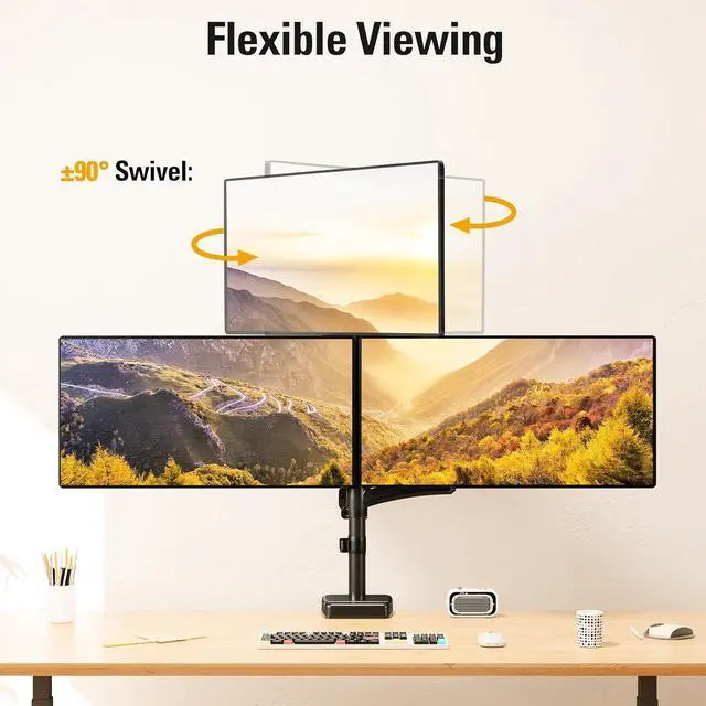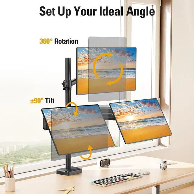 Fully Adjustable - The adjustable triple monitor mount is made with a stable gas spring, enabling a screen to be tilted from +90° to -90°, swiveled 180°, and rotated 360° from landscape to portrait.The height flexibility of the monitor arms allows for various screen stacking options, providing a comfortable gaming and watching experience