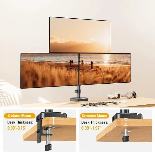 Two Mounting Options - This triple monitor stand can be installed in two ways. C-clamp fits most tables that are between 0.39 and 3.15 inches thick. Grommet base mounting fits desks from 0.39 to 1.97 inches thick. This strong monitor arm will hold your devices up well.