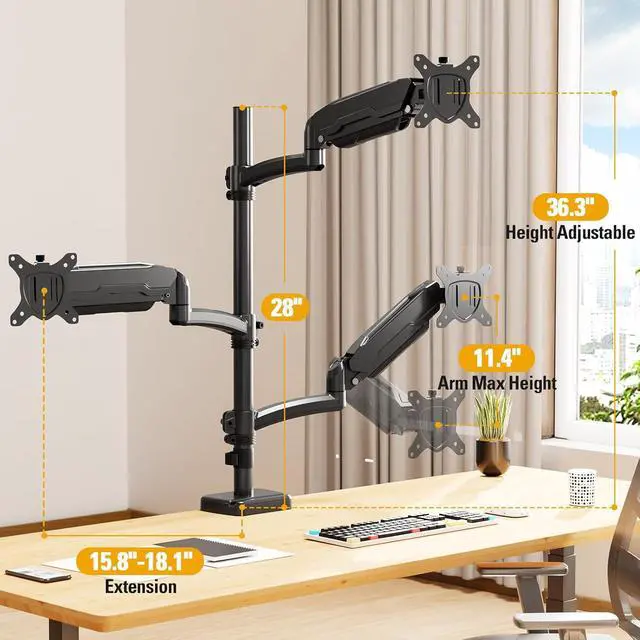 Ergonomic Viewing Height - Our triple monitor stand has a 28-inch column and a height of 36.3 inches max. The tall column design makes it more practical in various situations. The screen can be smoothly adjusted to a suitable height for sitting or standing positions. The triple monitor desktop stand extends to 18.1 inches, so you can work productively while staying comfortable.