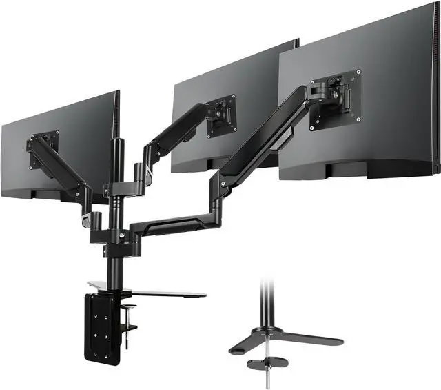 :The triple monitor stand is durable and made of cold-rolled steel, which is corrosion-resistant and not easy to rust. The VESA mount ensures a secure fit for curved, flat, or extra-wide monitors, and the thickened bracket tube ensures that the monitor does not droop or tilt forward when in use.