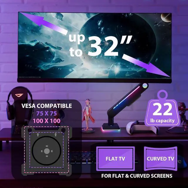 Fits Large 32 Screens: The computer single monitor stand is compatible with most 1732 flat or curved screens with VESA mounting patterns 75x75 or 100x100mm. The wide size range allows you to mount most monitors above the desktop to free up valuable desktop space. Heavy-duty monitor arm with built-in cable control professionally helping to hide wires.