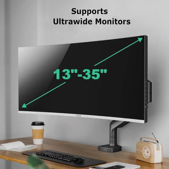 Single Monitor Desk Mount for 13-35 inch Ultrawide Flat/Curved Screens, Heavy Duty Gas Spring Monitor Arm Stand Holds up to 30.8lbs, Fully Adjustable, Clamp and Grommet Base