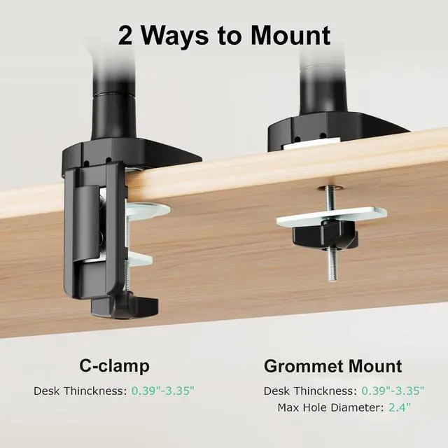 How to InstallStep 1: Choose the installation method of C-clamp or grommet mount according to your needs and affix it to the table ; Step 2: Attach your monitor to the VESA plate; Step 3: Adjust tension according to your monitor weight.
