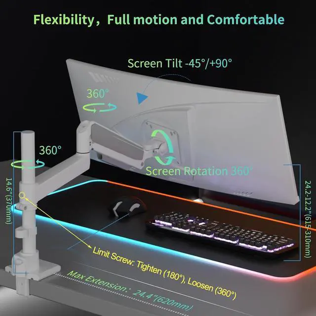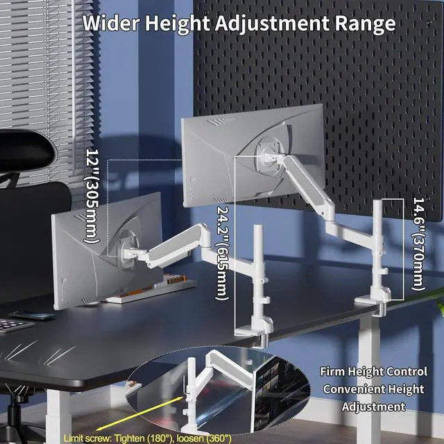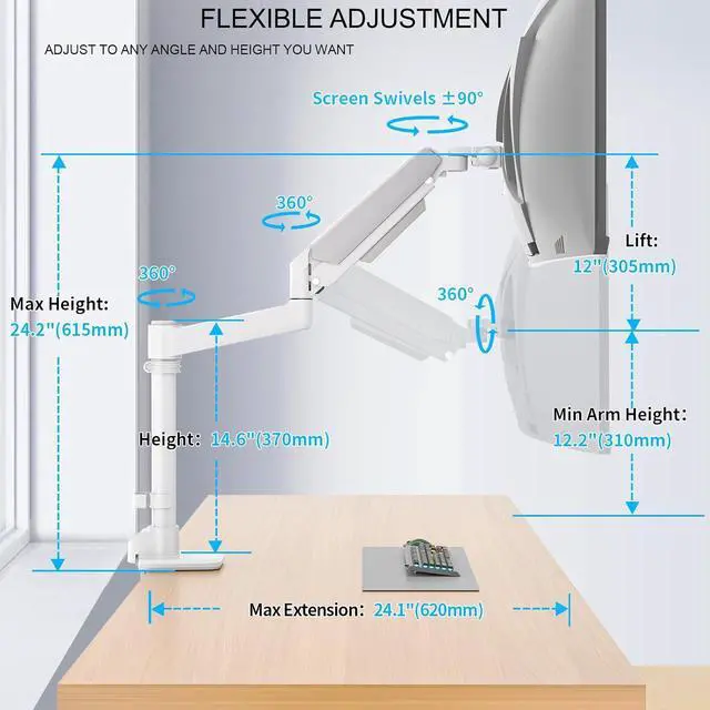 Fully Adjustable Single Monitor Stand : This single monitor mount offers -45° to +90° tilt, 180° swivel, 360° rotation adjustment.What's special is that it has dual height adjustment Column Height: 14.6" (370mm) Monitor Arm Lift Range: 12" (305mm)This design allows for smooth stacking height adjustmentPlusmaximum extension to 24.4"(620mm) with pneumatic spring lift. It caters to your preferred Angle of view and adjusts smoothly and effortlessly