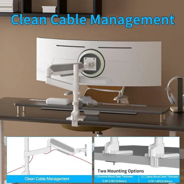 Ultrawide Compatibility Single Monitor Arm: This single monitor arm desk mount is designed for bigger and heavier flat and curved monitors, fits 17-60 inch computer screens, holds 4.4-44 lbs(2-20kg). The single monitor mount is suitable for VESA patterns 75x75mm and 100x100mm;Two mounting options : You may choose to use either a C-clamp or grommet mount, desk thickness range: 1.C Clamp Mount Desk Thickness: 0.79"-1.96"(20-50mm);2.Grommet Mount Desk Thickness: 0.39"-2.36"(10-60mm). The bottom of the desk should not have any cross beams or panels, as this will interfere with installation