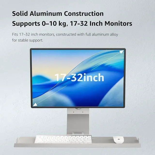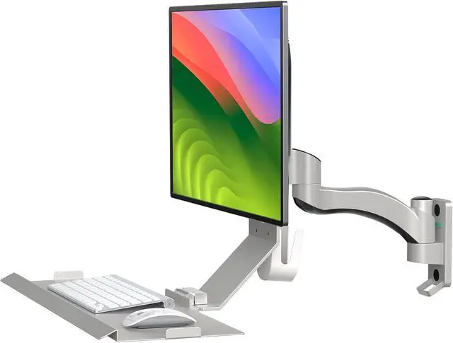 Computer WorkstationErgonomic standing desk with a VESA compatible (75x75/100x100mm) single monitor arm supports any display including Ultrawide up to 22lb (10kg); Wall-mounted sit-stand workstation with keyboard and mouse tray60*20cm fit full size keyboard and mouse. Foldable keyboard tray saves space when not in use.