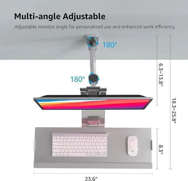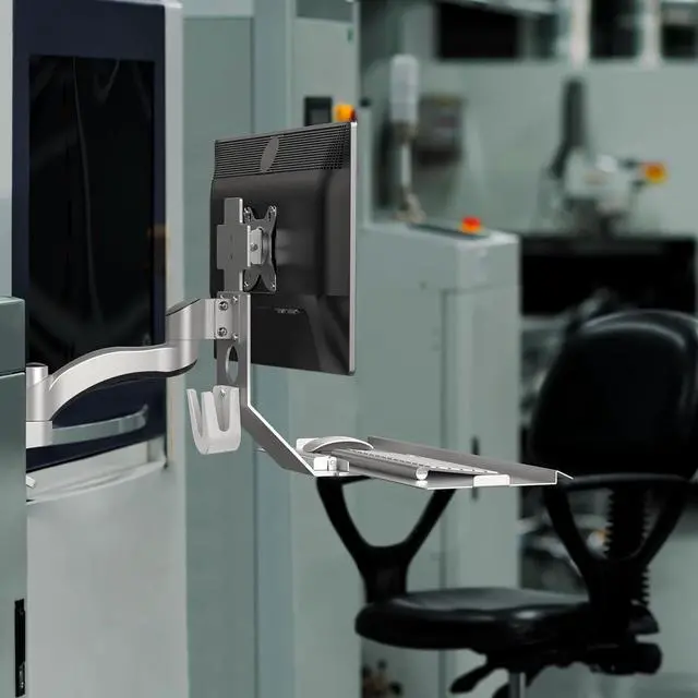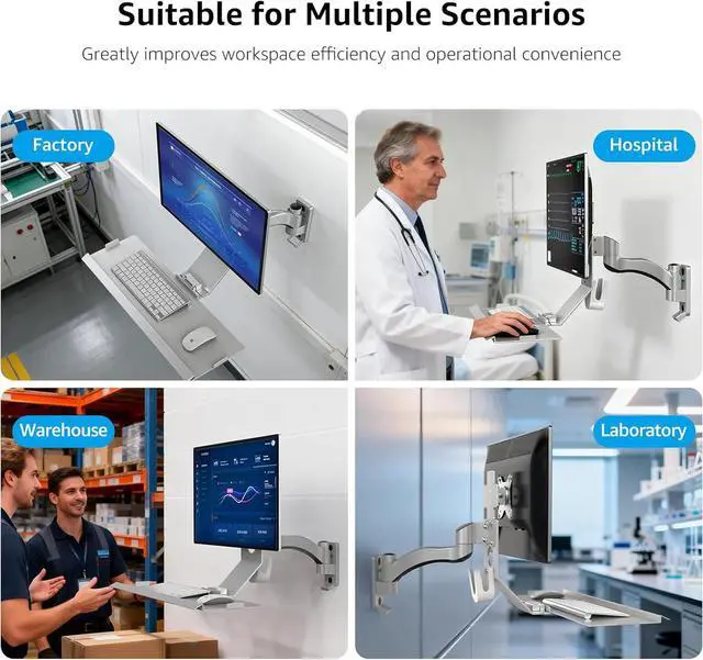 Use CasesThis monitor mount with keyboard tray is suitable for all kinds of places, from office to hospital,lab,factory, medical shops etc.Save space, facilitate real-time access to various data, convenient and fast.