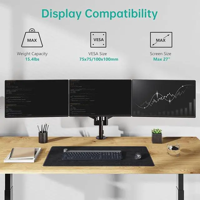 UNIVERSAL COMPATIBILITY: Upgrade your workspace with this triple monitor stand, specifically designed to support three screens up to 27inch each. Each heavy-duty arm holds up to 15.4 lbs, ensuring a stable triple monitor setup. It is fully compatible with VESA mounting holes (75x75mm and 100x100mm). Note: Please verify your monitor's VESA pattern and weight before purchasing to ensure a Excellent-fit