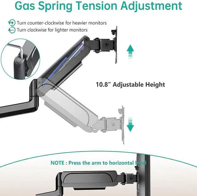 FULL MOTION ADJUSTABILITY: Experience fluid movement with our gas spring monitor mount. Equipped with a laboratory-tested pneumatic spring arm, this articulating monitor arm offers seamless, tool-free adjustments. Enjoy +35°/-35° tilt, 180° swivel, and 360° rotation for landscape or portrait modes. The height-adjustable monitor stand allows you to find the optimal position for your uni-que workflow