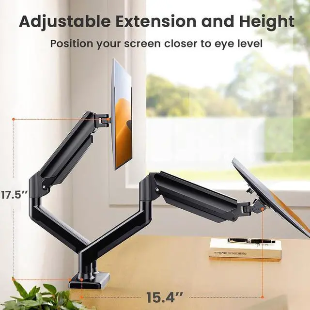 ERGONOMIC VIEWING EXPERIENCE: Elevate your workspace and improve your posture. Our dual monitor desk mount extends up to 15.4inch forward and raises your screens up to 17.5 inch above the desk surface. By bringing monitors to eye level, this vesa mount dual monitor setup significantly reduces neck, back, and shoulder strain, boosting your daily productivity and comfort