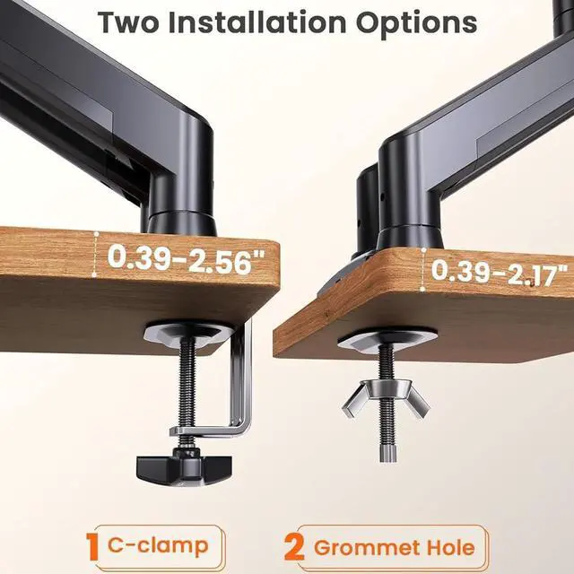 SPACE-SAVING & EASY INSTALLATION: Fr-ee up valuable workspace and keep cords organized with built-in cable management. This dual desk monitor stand offers two mounting options: a sturdy C-clamp (fits desks 0.39"-2.56" thick) and a Grommet base (fits desks up to 2.17" thick). The clear instructions and included hardware make assembling your double monitor stand quick and hassle-fr-ee