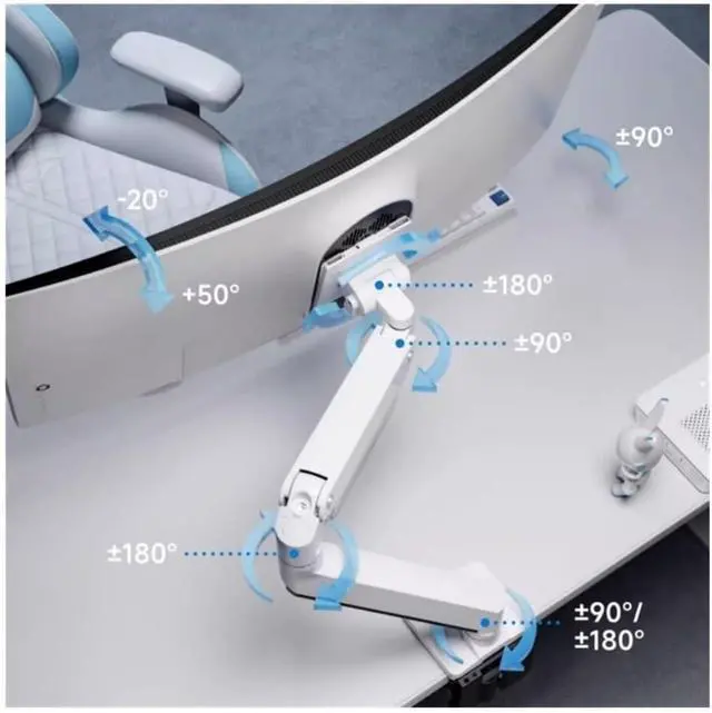 Fully Adjustable - Monitor arm offers an exceptional range of flexible motion featuring +50° to -20° tilt, 180° swivel, 360° rotation, and 13 inches of smooth height adjustment with pneumatic spring lift. Clear cable management covers conveniently route your cords for a clean display that encourages smooth screen adjustments.
