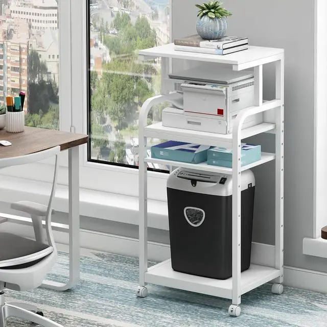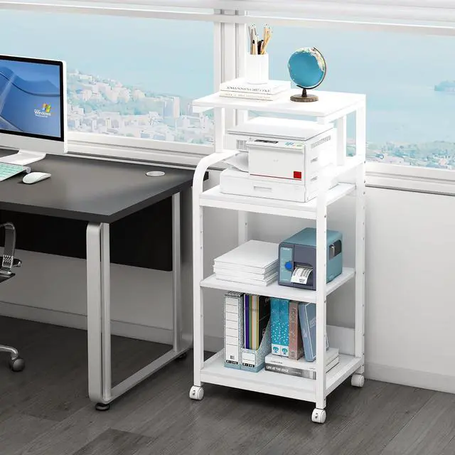 Space Saver for Home OfficeWith 4 tier design but compact size 20.8"W x 15.7"D x 43.3"H/44.5"H, this printer stand offers plenty of storage capacity while saving a lot of floor space, a perfect solution for small office spaces to keep printers, scanners and fax machines as well as your other office supplies such as files, books, stationeries, printing papers and so on in one place, freeing up your work space and giving you a neat and tidy office.