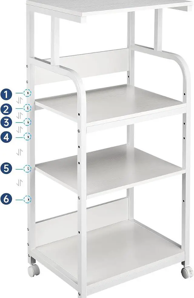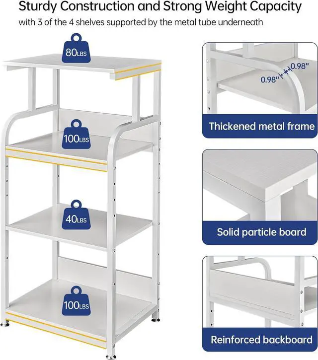 Sturdy and Heavy DutyWith 3 of the 4 shelves braced by the robust steel tube underneath and additional two backboards, this printer stand comes as sturdy as a rock and possesses exceptional load capacity. High quality particle board with water- & wear-resistant surface and 0.98in reinforced square steel tube frame, which is thicker than usual 0.78in tube, makes the printer table quite a durable furniture that will hold up for years to come.