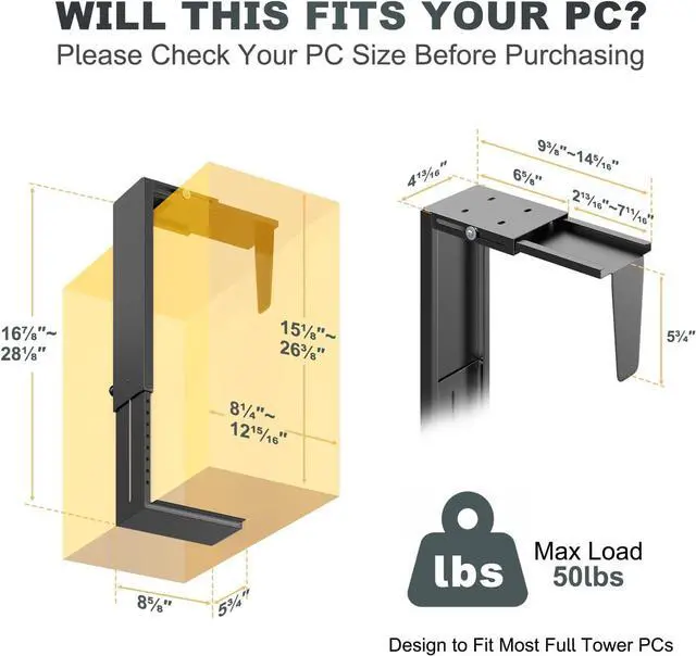 Secure & Adjustable PC Mount: Safely organize your computer tower. This sturdy steel mount holds up to 50 lbs and fits most cases (adjustable width & height). Soft padding protects your PC from scratches while keeping it elevated and dust-free.