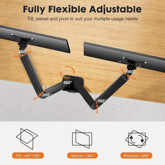 Full Motion Adjustability for Comfort: Easily adjust the monitor arm with tilt (-45° to +90°), swivel (180°), and rotation (360°) to achieve the perfect viewing angle. This ergonomic design reduces neck and eye strain, helping you stay focused during work, online classes, or movie nights, all while maintaining stability without wobbling.
