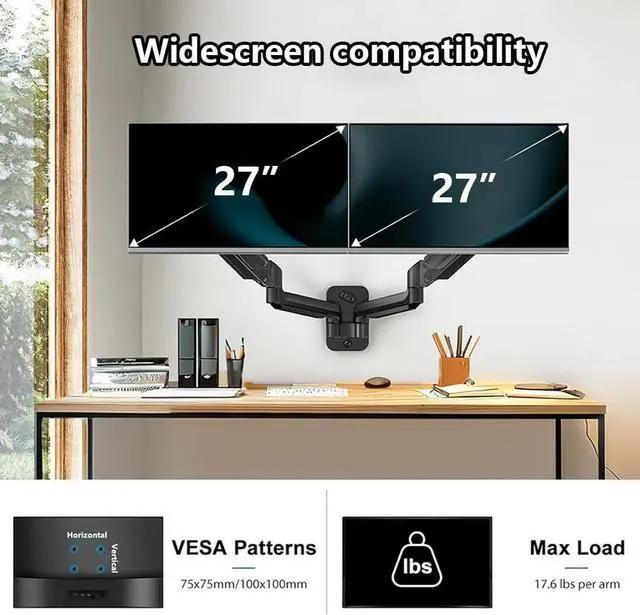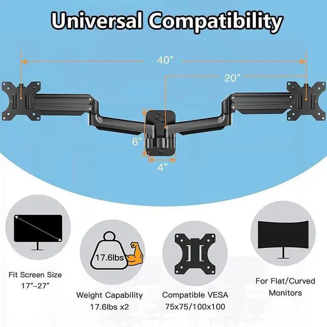 Compatibility This monitor arm accommodates two monitors ranging from 17 inches to 27 inches, each weighing no more than 17.6 pounds (approximately 8 kg). It provides stable support for the monitors.
