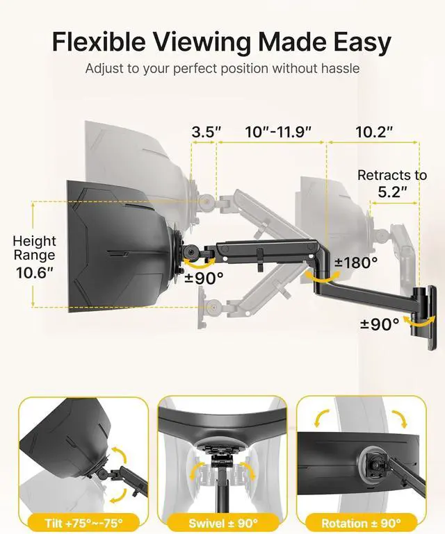 Premium Wall Mount with Full Motion The aluminum and steel gas-spring arm supports 4.459.4 lbs screens and offers +75°/-75° tilt, ±90° swivel, 180° rotation, and up to 27.4" extension. Easily position your screen for ergonomic work, entertainment, or gaming setups