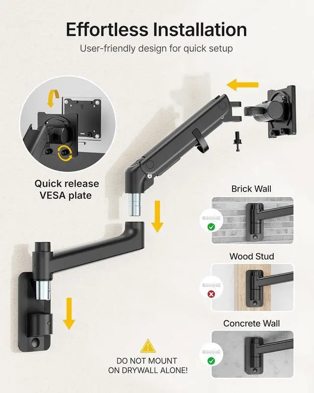Easy InstallationDesigned for wood studs, brick, and concrete walls (Note: Please do not mount to drywall alone). The quick-release VESA plate makes installation effortless, allowing you to set up this monitor wall mount within 10 minutes. Ideal for use in office, home, studio and gaming setup, which is a multifunctional tool to enhance your efficiency and productivity