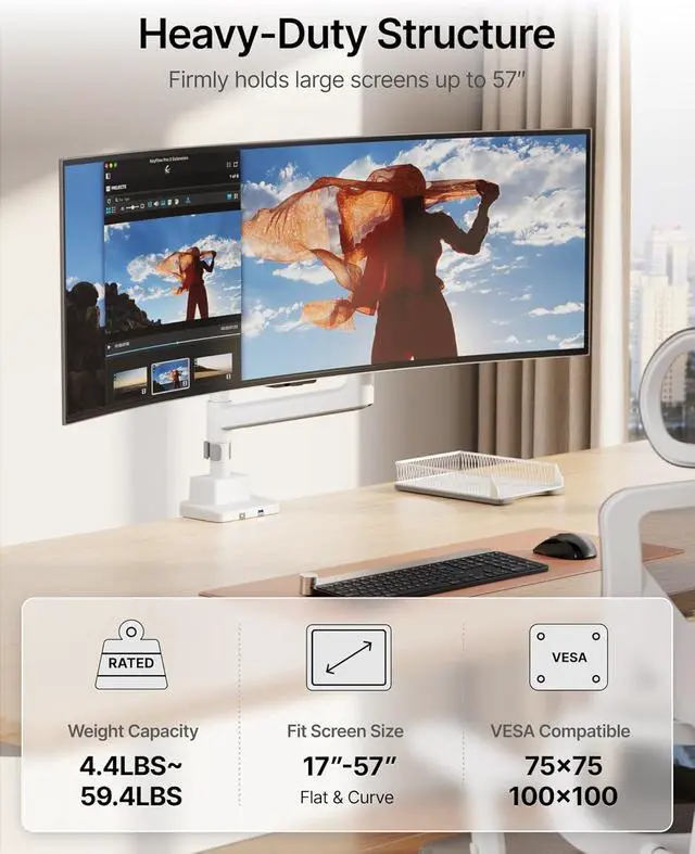 Enhanced Compatibility for Large Monitors This bundle combines a heavy-duty ultrawide monitor arm with a universal VESA expansion kit, supporting 17"57" curved screens up to 59.4 lbs. Compatible with VESA 75x75mm, 100x100mm, and expanded patterns up to 200x200mm & 300x300mm