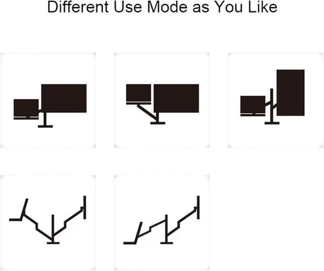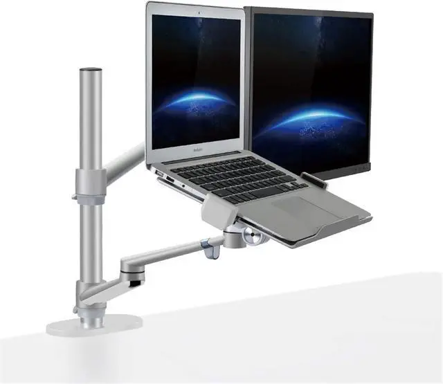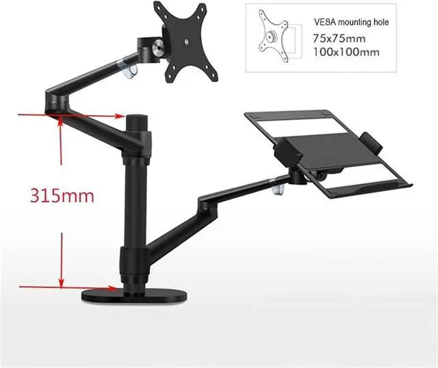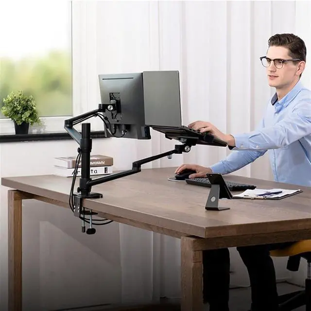 Adjustable-- The screen can freely swivel 360 degree, and easily adjust the monitor and laptop to the most comfortable position,monitor mounting arm offers +90°/-55° degree tilt, the maximum extension length up to 52cm/20.5", reach the height of 43cm/16.9", Laptop mounting arm offers 45 degree tilt, the maximum height up to 42cm/16.5".