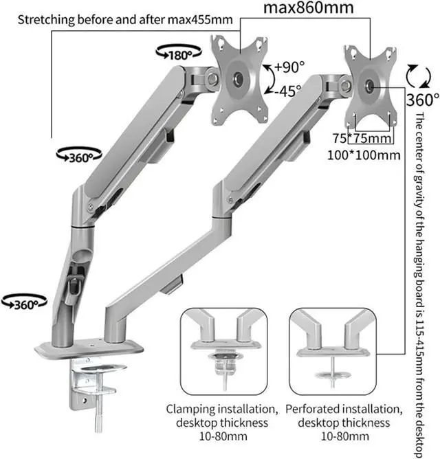 Compatibility: Fits one monitor up to 30", maximum support weight up to 19.8lbs/9kg. Detachable with 75x75mm or 100x100mm compatibility. Table clip and perforated mounting.