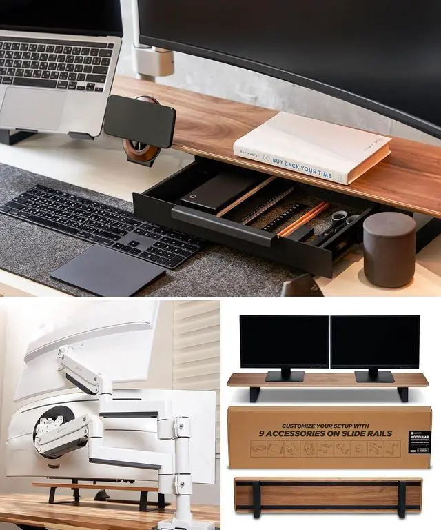 Reclaim Valuable Desk Space - Elevate your monitor off the desk and store your laptop, tablet, phone, and headphones neatly underneath the wooden riser.