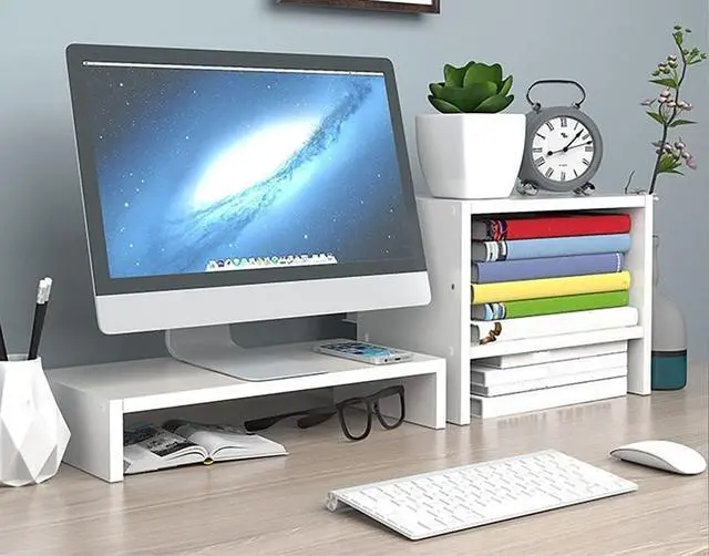 Computer Stand Organization: Declutter your workspace effortlessly by storing office supplies, keyboards, or media devices beneath the raised monitor. Our computer stand features non-slip pads and a sliding keyboard tray, creating a tidy and efficient setup for your home, office, or living room