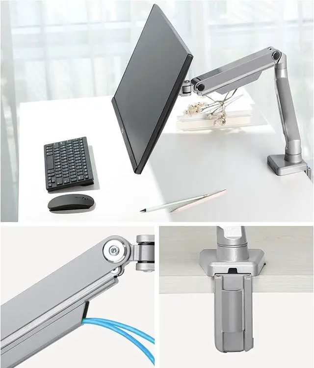 ? This gas spring dual monitor bracket has the function of ±90° left and right rotation screen, ±90° pitch angle adjustment, and 360° horizontal and vertical screen rotation, which helps to create an ideal viewing angle and an ergonomic viewing position
