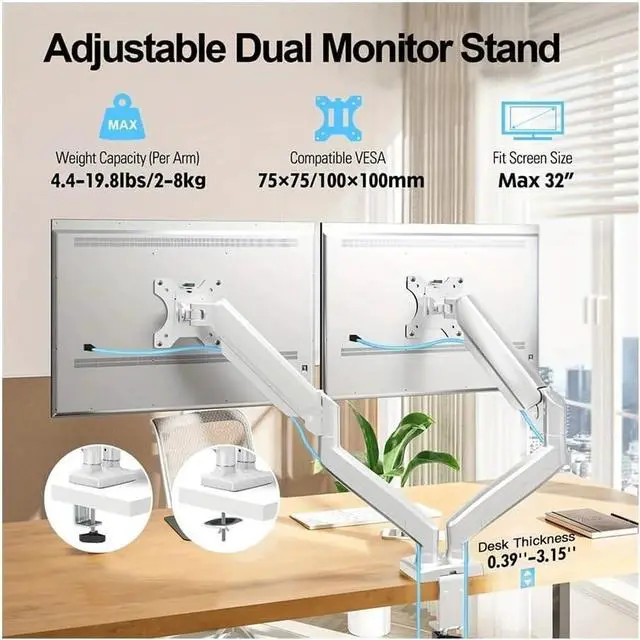 This dual monitor desk mount is engineered to accommodate screens up to 32 inches in size. Whether you prefer a pair of sleek, widescreen displays for immersive gaming or multitasking at work, it has you covered. Each arm can support up to 19.8 lbs, ensuring stability for a variety of monitor models