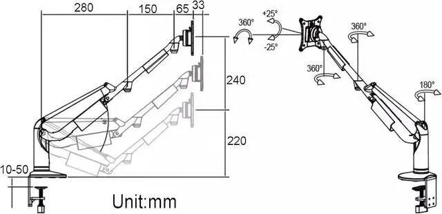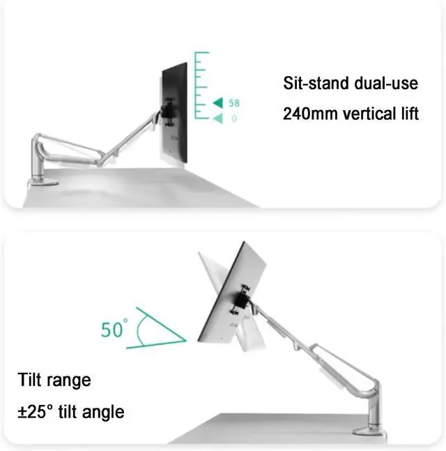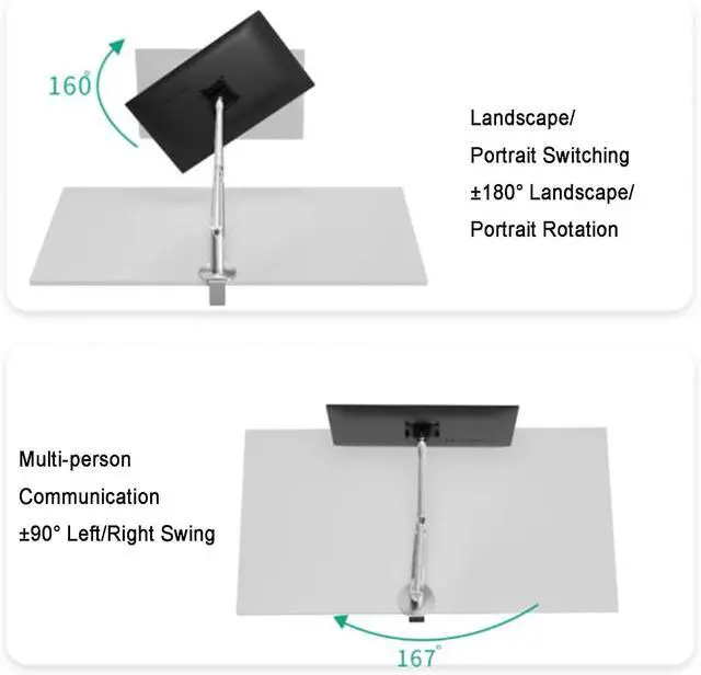 Full Motion Monitor Stand: Supports 360° screen rotation (horizontal or vertical), 180° rotation (shared display), and 25° upward/25° downward tilt (for optimal viewing). 240mm vertical height adjustment makes it easy to find the right viewing angle and position