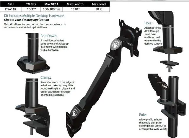 Flexible mounting options: Installs using desk clamp, through-hole, bolt-down, or pole-mount configurations for versatile setups