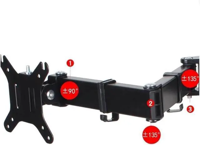 Full Articulation - Adjustable mount offers +45° to -45° tilt, 180° swivel, 360° rotation, and height adjustment along the center pole. Warning: Please do not pull monitor(s) too far forward or backward beyond the stand's center of gravity, as this will cause stability issues.