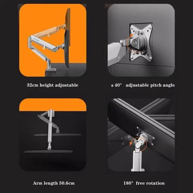ARTICULATION & HEIGHT ADJUSTMENT The single desk monitor mount uses high-performance gas spring cores, mount offers +40° to -40° tilt, 180° swivel, and 360° rotation. Monitor can be placed in portrait or landscape shape.