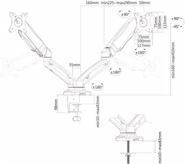 • The monitor arm offers full monitor movement with 19.6" of arm extension and 9.8'' of height adjustment range. The dual monitor arm with a gas spring provides smooth and durable adjustments. Please adjust the tension of the gas spring arm properly according to the weight of your monitor.