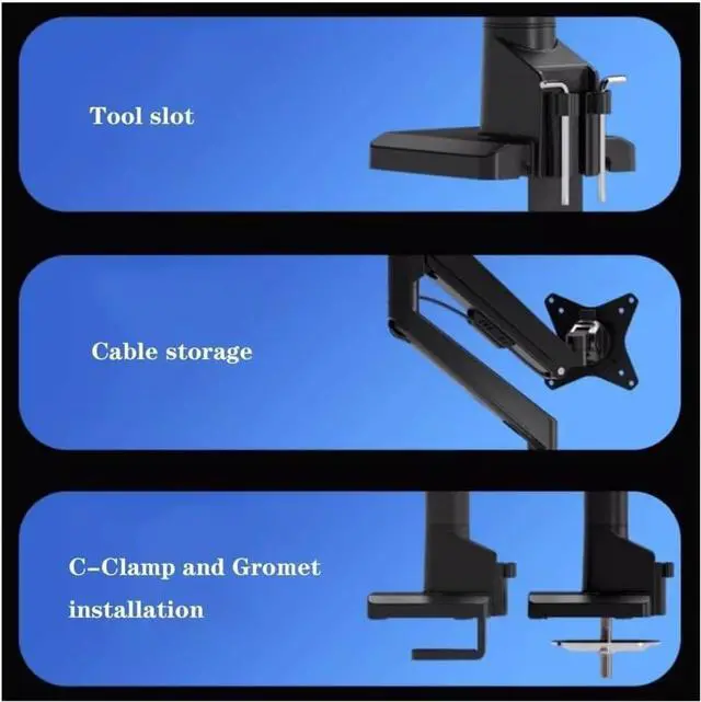 Installation MethodThe two-stage locking system is compatibility for 0.39"~1.96" thick desk for both C-clamp and Grommet Base.