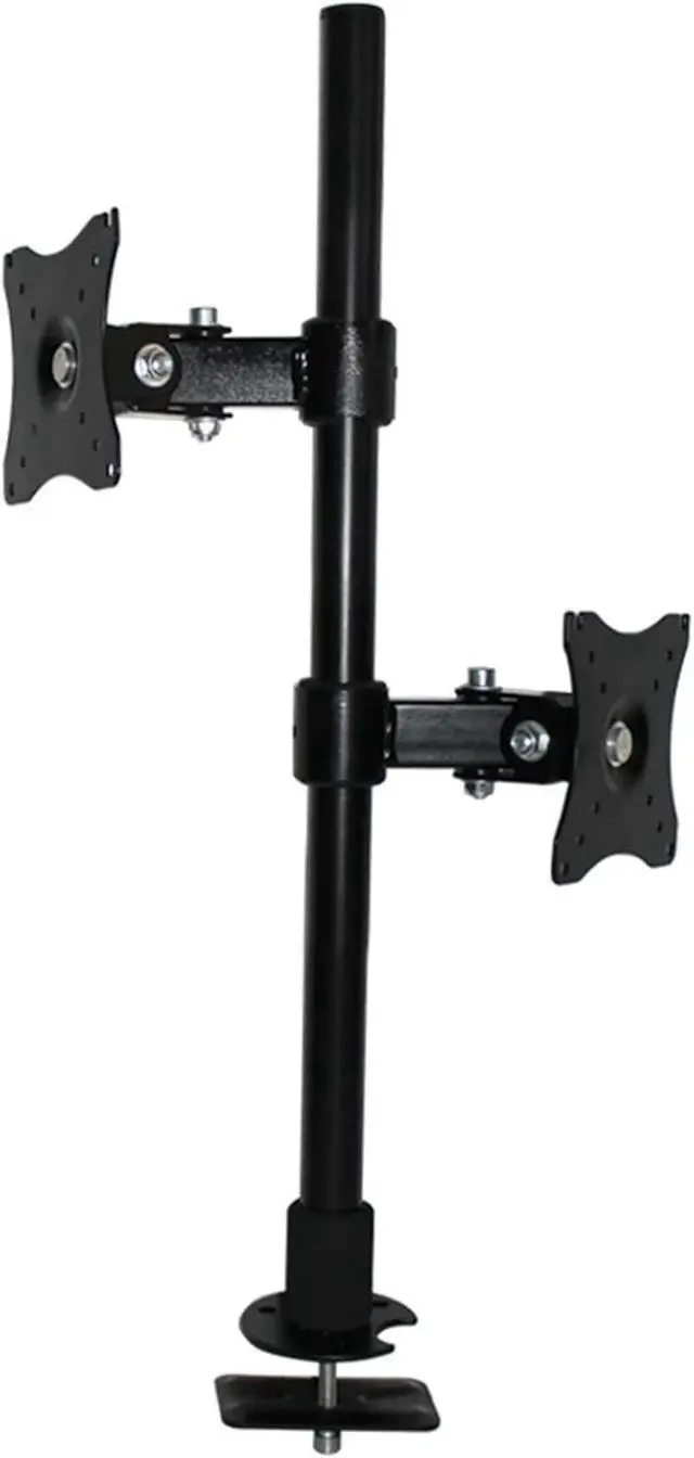 1. Fits 14" To 27" Screens - Dual vertically stacked monitor mount fitting two screens 14 to 27 in size and 14.3 lbs in weight (each) with 50x50mm/75x75mm/100x100mm mounting holes. Mounts to desks (up to 2.3" thick) with heavy duty grommet mount.