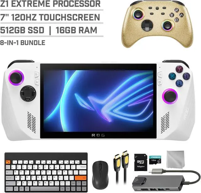 ASUS ROG Ally 512GB Gaming Handheld 7-inch Touchscreen 120Hz FHD 1080p AMD Ryzen Z1 Extreme Processor, Mytrix Gold Wireless Pro Controller, Hub, 128GB MicroSD, Keyboard & Mouse, 8 in 1 Bundle