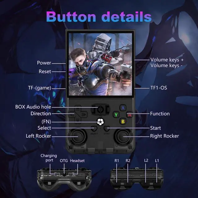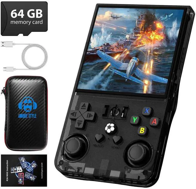R36MAX retro handheld game consoleDVJQSN R36MAX retro gaming console,64GB Built-in 18,000+ Classic Game , Equipped with RK3326 64-bit quad-core processor, it can run 2D/3D games smoothly, this r36max handheld game console delivers endless fun, Choose between 64GB or 128GB storageyour favorite handheld emulator are always ready