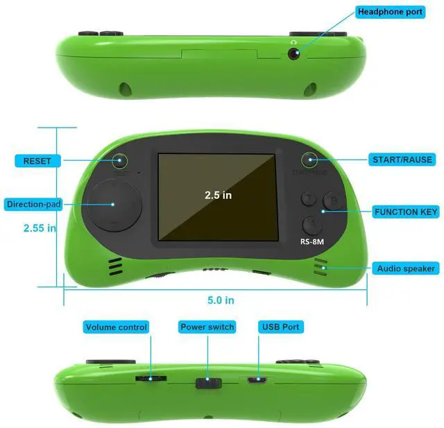 Handheld games console can be charged with USB cable under low battery or no power. Play games about 4 hours after fully charged.