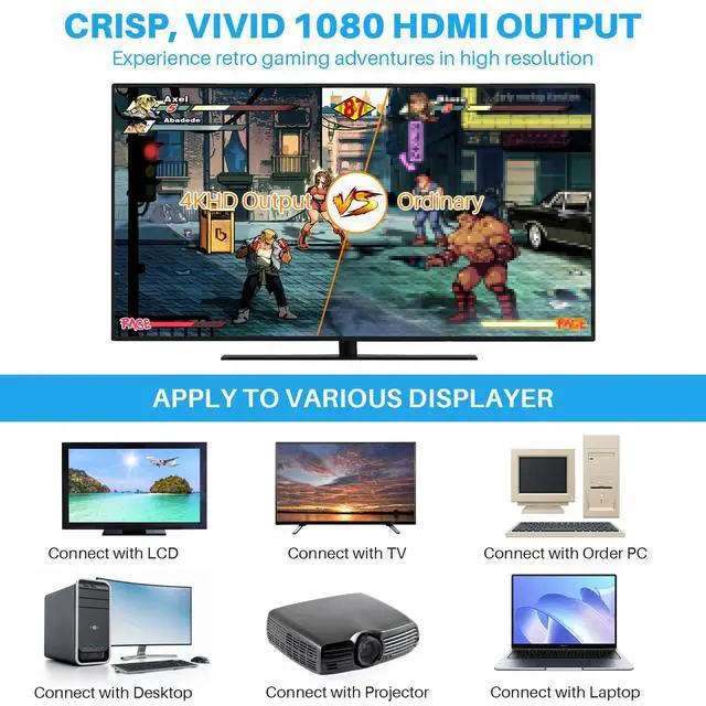 Retro gaming stick for 4K Ultra HD TV/PC/Monitor/Projector, support HDMI connection (not AV output). And comes with 64GB TF card.