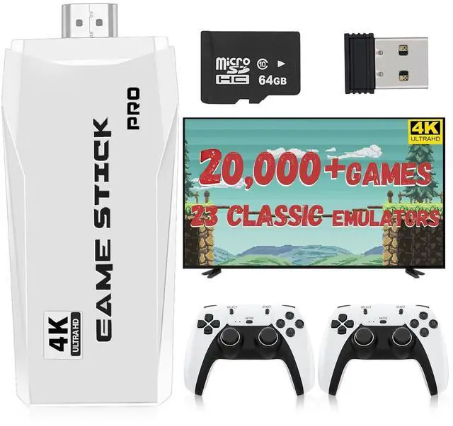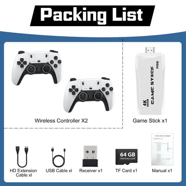 What's in the box:1 * Game Console Stick;2 * Wireless Controllers;1 * HD-Compatible Extension Cable;1 * 64G USB Receiver;1 * Power Cord.