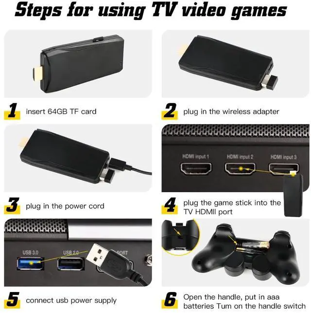 Package Includes: Game Console *1, HDMI Extension Cord *1, USB Charging Cable *1, USB Receiver *1, Wireless Gamepads *2, Instructions *1.If you're not satisfied with our Classic Mini Retro Game Console, please contact us, and we'll solve your problem promptly.
