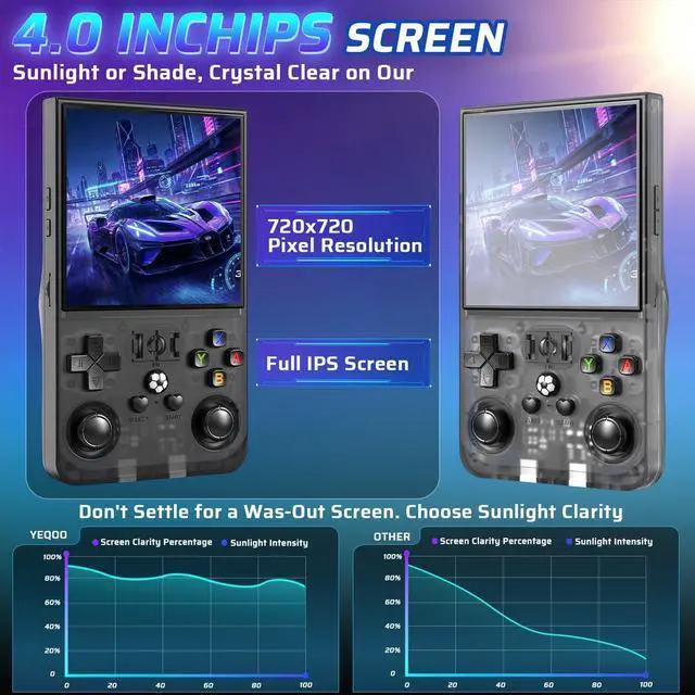 Vivid IPS Display & Ergonomic ControImmerse yourself in stunning clarity with the R36MAX's 4.0-inch IPS HD screen (720*720 resolution). It showcases rich RGB colors and sharp details, reducing eye strain during long sessions. Combined with comfortable buttons, dual 3D joysticks, and a curved back with precise LR triggers, this retro handheld is designed for superior control and a truly engaging video gaming experience