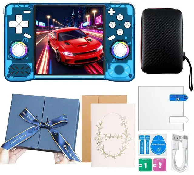 This ideal gift set includes 1x HatiLuminis game console, 1x organizer bag, 1x TYPE-C charging cable, 1x 128GB TF card, 1x screen film, and 1x manual, suitable for family, friends, game lovers, and nostalgia players.