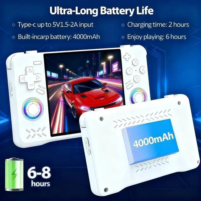 The portable design, powered by a robust 4000mAh rechargeable battery, offers up to 10 hours of playtime, making it perfect for gaming on the go, whether commuting, traveling, or relaxing outdoors.